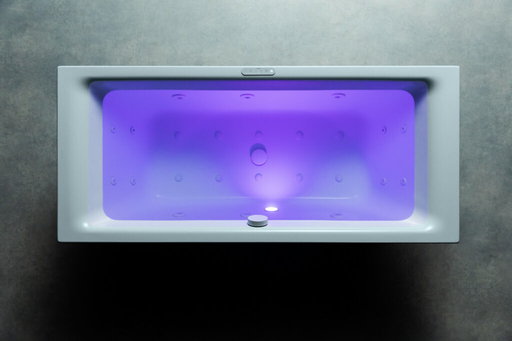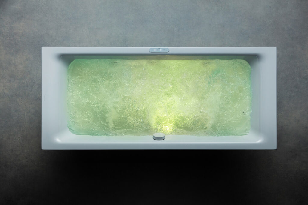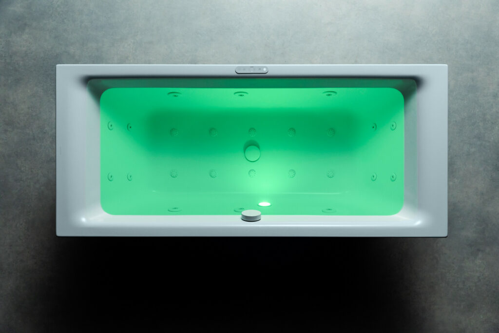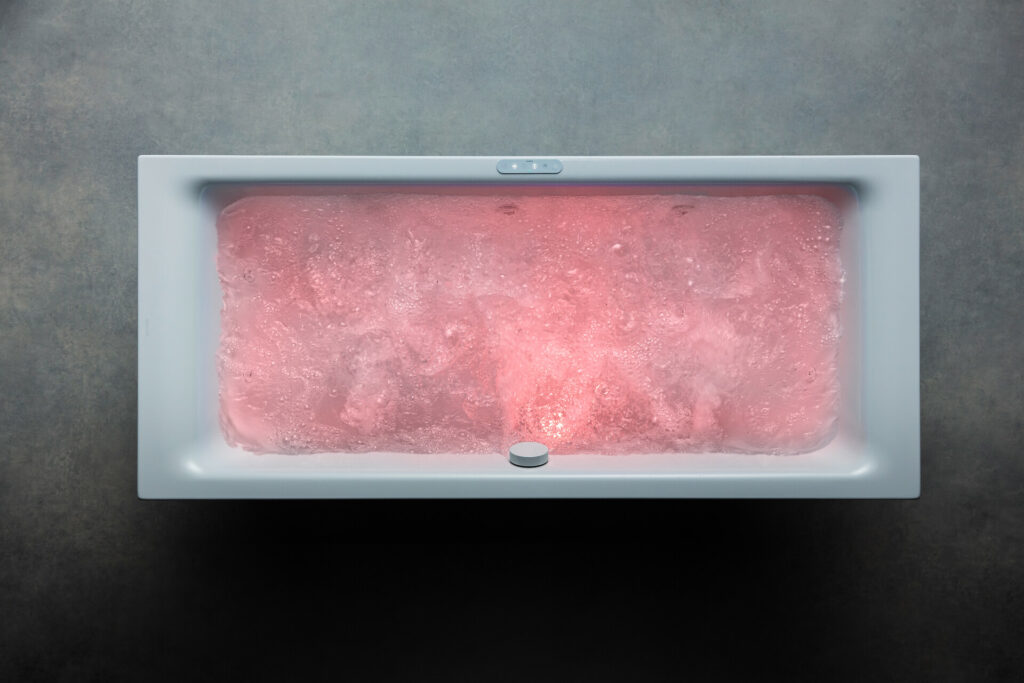 Mit ihrer Spektrallicht-Funktion sorgen die Whirlsysteme von Kaldewei für ein faszinierendes Spiel aus Licht, Luft und Wasser. Ob ein anregendes, tiefes Rot, ein sanftes, seidiges Grün, ein luftiges Blau oder ein neutrales Weißlicht – seit jeher ist die positive Wirkung von Licht und Farbe auf Körper und Geist bekannt und sorgt in Verbindung mit Wasser für noch mehr Tiefenentspannung. Für das ultimative Wellness-Erlebnis lässt sich so ganz einfach eine wohltuende Wasser- oder Luftmassage mit der Energie des Spektrallichts kombinieren.